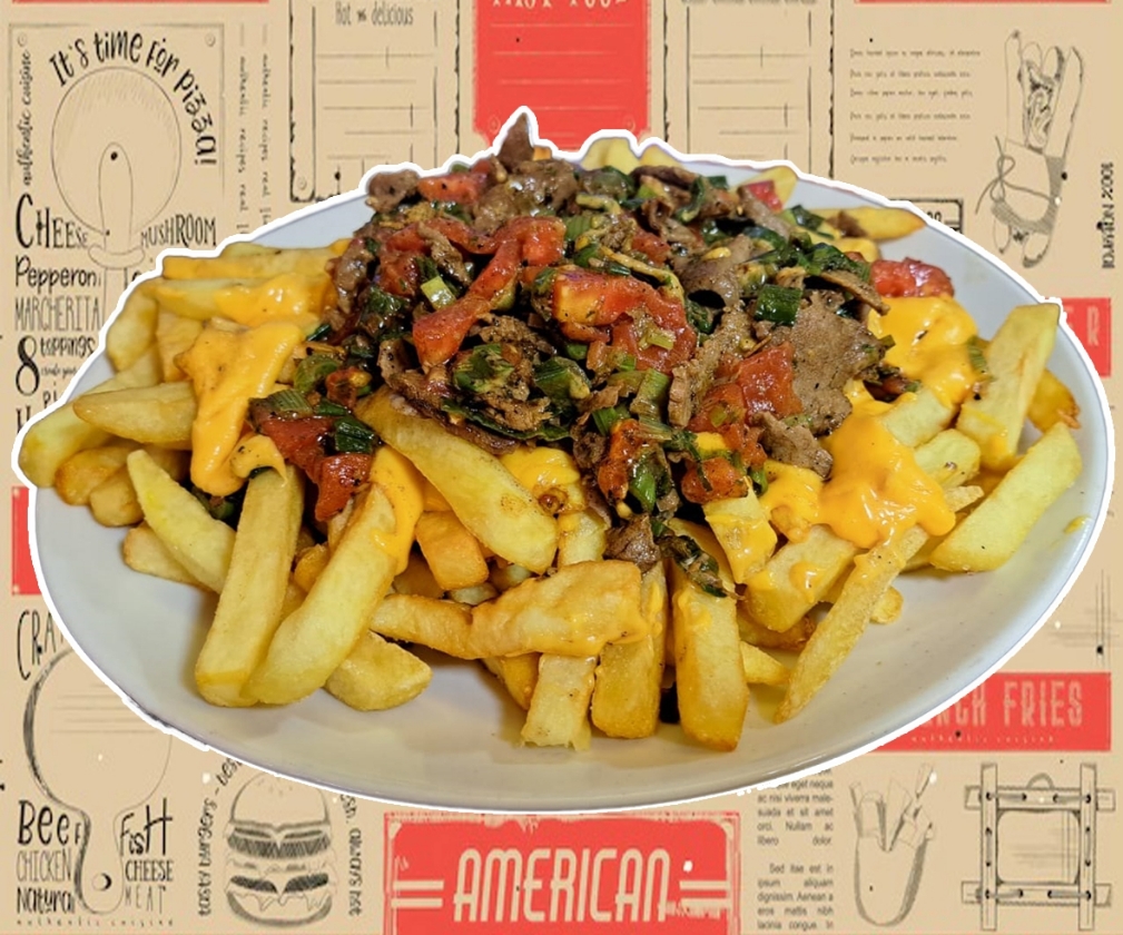 Papas fritas, queso cheddar, carne, tomate y cebollín.
